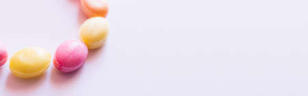 Close up view of colorful lollipops on white background with copy space, banner