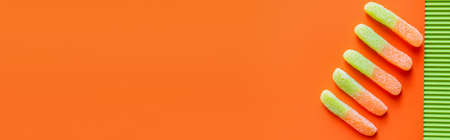 Top view of colorful jelly sweets on green and orange surface, banner