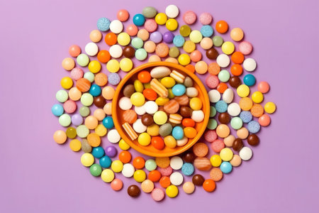 An overhead view of a mesmerizing mosaic of colorful candies, creating a vibrant backdrop