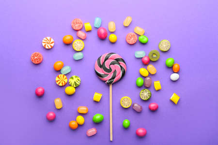 Assortment of sweet candies on color background