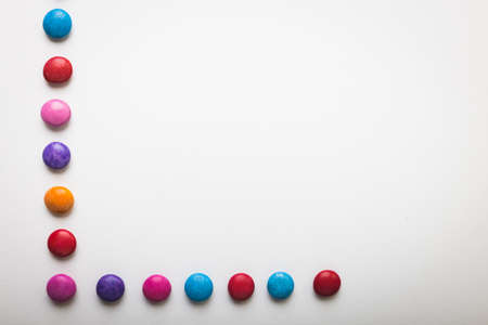 Directly above view of colorful chocolate candies arranged by copy space on white background. unaltered, unhealthy eating and sweet food concept.