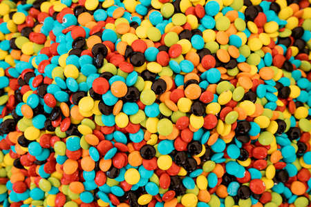 Texture of vibrant multi colored sweet spheric candies. Background made of candies