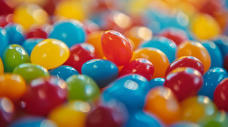A close-up of assorted colorful jelly beans with a glossy texture, showcasing their vibrant colors and playful appeal, perfect for candy and sweetness themes.