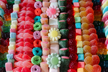Wide variety of colorful candies are laying on a surface, creating a vibrant and festive sugary background