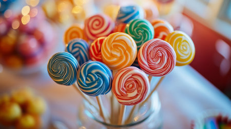 A beautiful arrangement of lollipops in a glass vase as a centerpiece at a dessert table, highlighting their decorative appeal at a celebration.
