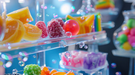 This vibrant image showcases a delightful arrangement of candies and sweets, surrounded by playful bubbles and colorful light effects, evoking joy.