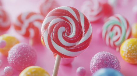This image features a vibrant swirl lollipop on a soft pink background, highlighting its colorful stripes. Perfect for designs related to sweets and fun.