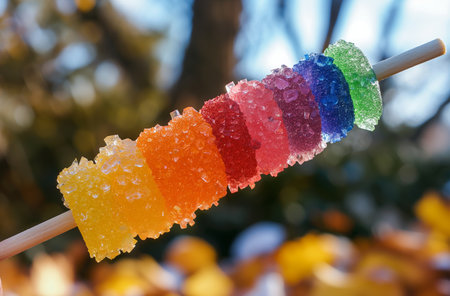 Sugar crystals forming a rainbow pattern on a wooden stick, representing LGBT colors, against a blurred natural background