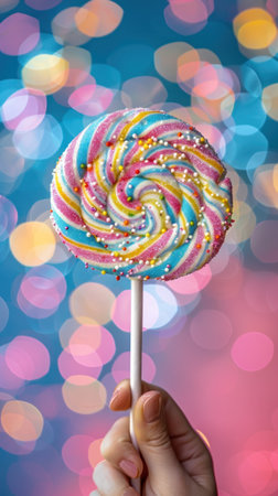 A close-up of a woman hand holding a brightly colored lollipop from a festive stall.