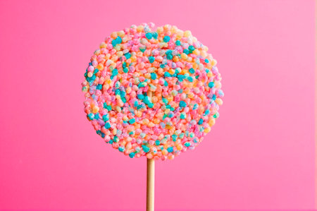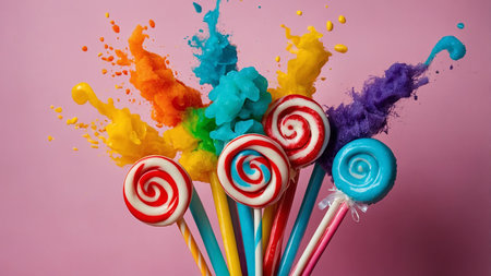 A vibrant display of colorful lollipops with swirling patterns, set against a pink background. Exploding rainbow-colored powder adds a dynamic and festive touch to the composition, making it perfect for themes related to fun, celebrations, and confectionery. The playful and energetic image is ideal for advertising, design projects, or party invitations, capturing the joy and excitement of sweet treats. AI generated image.