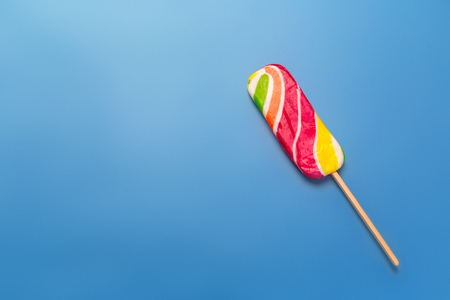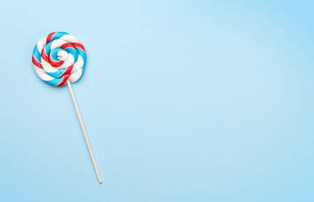 Colorful candy lollipop over blue background. Top view flat lay with copy space