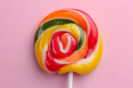 Colorful lollipop swirl on stick. Striped spiral multicolored candy on pink background, top view