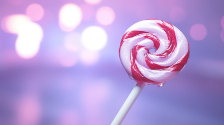 Red and white swirled lollipop, light bokeh Christmas holiday background, AI generated
