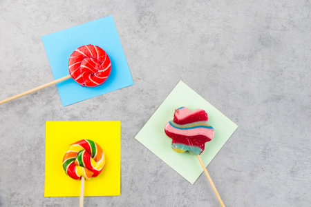 Colorful candies, lollypop on the colorful background, multicolored minimal style top view.