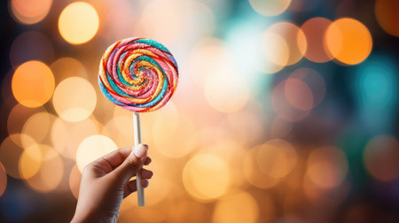 A persons hand holding a vibrant and colorful lollipop against a clear background. Generative AI