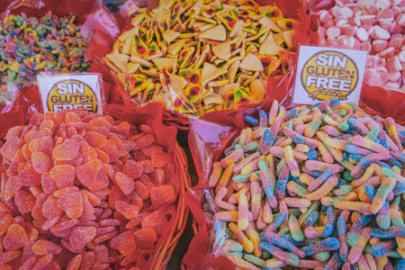 Carmona Spain July 19, 2021 Various sweet candies sold at the local market in downtown during Coronavirus outbreak hitting Spain, wearing a mask is mandatory