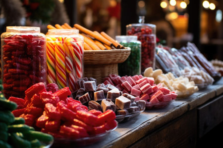 candy canes, licorice, and other sweets at a christmas candy stall, created with generative ai