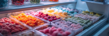 A cozy kitchen freezer is filled with a variety of colorful frozen snacks neatly organized for convenient access and delightful treats when needed