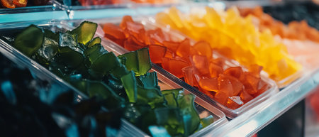 Colorful gummy candies in a store display, showcasing a variety of shapes and flavors in bright, enticing colors.