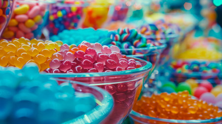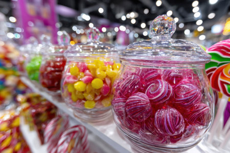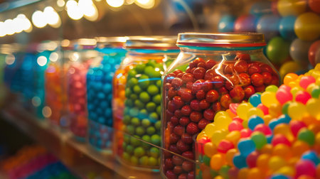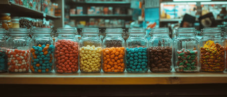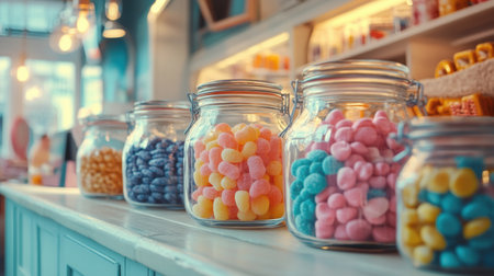 Colorful candy jars filled with various sweets displayed in a candy shop, creating a cheerful and inviting atmosphere. Ideal for candy, sweets, and retail themes.