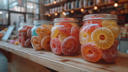 A glass jar filled with colorful gummy candies captures the essence of sweetness and joy in a dynamic candy shop environment, evoking nostalgia.
