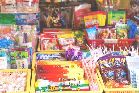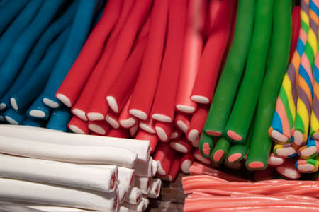 Sweets are harmful to health. Multi-colored sweets with a lot of sugar, in the form of sticks, are sold in a pastry shop.