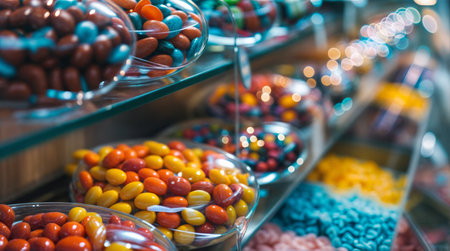 A vibrant display of colorful candies in a store, creating a lively and joyful atmosphere. Perfect for themes of sweets, retail, and celebration.