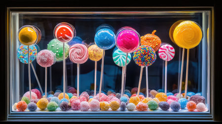 A vibrant and playful candy shop window display featuring oversized lollipops and assorted colorful sweets, capturing the essence of joy and indulgence.