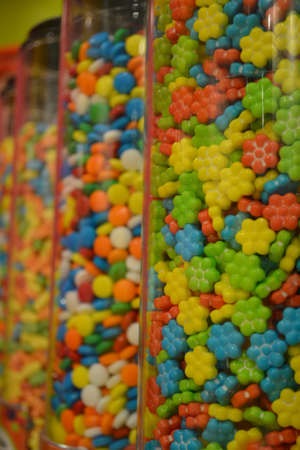 Various candies, gummy jellies, chewing gums, lolly, etc arranged in glass containers