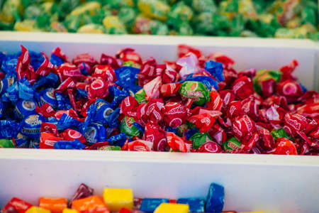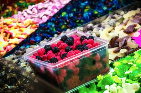 showcase of candy shop, transparent container with various sweets, marshmallow, jelly, chewy gums,