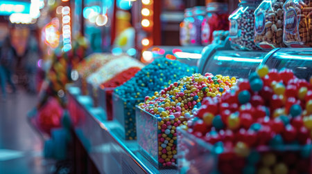 A variety of colorful candies displayed in a retro style shop, with bright neon lights creating a nostalgic and playful atmosphere.