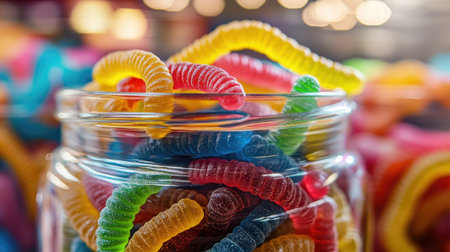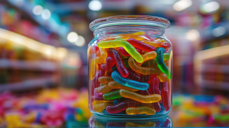 A closeup of a glass jar filled with colorful gummy worms displayed in a lively candy shop, highlighting the joyful atmosphere and vibrant selection of sweets.