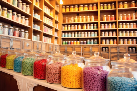 Shelves lined with glass jars showcasing a vibrant assortment of candies, evoking nostalgic memories of traditional candy shops. A captivating scene of sweet indulgence and classic confectionery presentation.