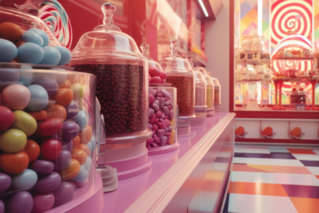 retro candy shop filled with classic treats, including jellybeans and lollipops, created with generative ai