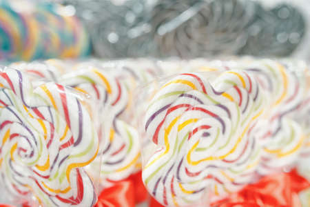 Coloured lollipops on stick on shop window. Caramel snacks on sale. Sweet candies dessert for kids.