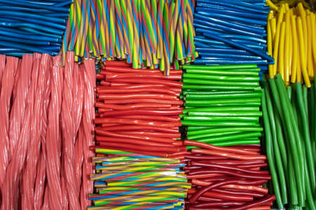 Sweet candies rope string shaped sweets dessert food generate a beautiful colorful and interesting pattern.