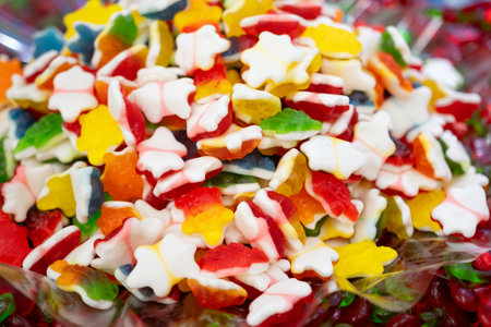 Closeup a background from colorful sweets of sugar candies. Assortment tasty gummy