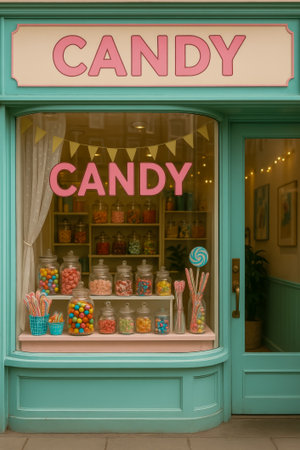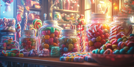 A colorful candy shop scene with jars of sweets, lollipops, and festive decorations, evoking a sense of nostalgia