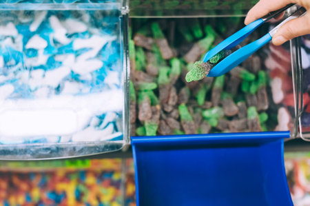 Hand using blue plastic tongs to pick up a green and brown gummy candy from a clear container filled with similar candies in a candy store. Other containers with different colored gummies are visible in the blurred background.