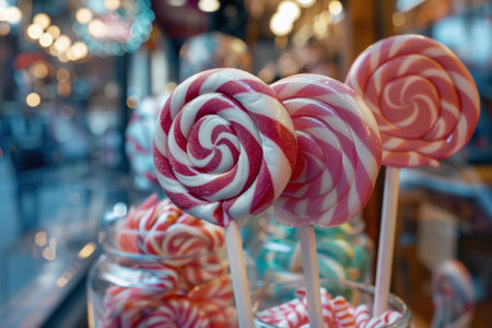 A bright and colorful candy store display filled with rainbow-colored lollipops and candies in jars, inviting you to indulge.