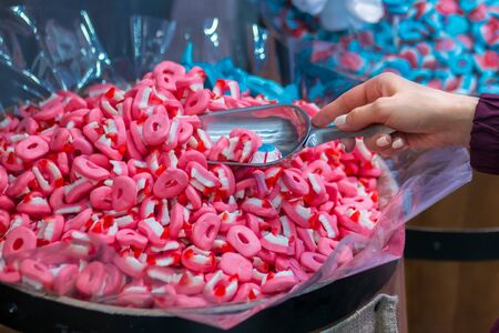 Woman hand with scoop taking colorful delicious marmalade jelly candies on counter of shop, grocery, market, cafe. Dessert, copy space, sweet food, pattern, confectionery and Halloween concept