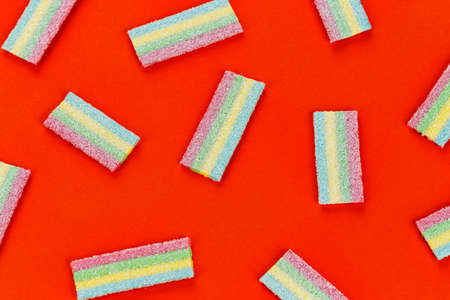 A lot of multi-colored jelly sweet candies on a red background.