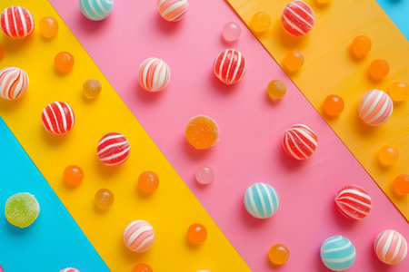 A delightful flatlay of assorted candies showcasing vibrant colors and unique shapes. Perfect for festive occasions, advertisements, or sweet-themed projects.