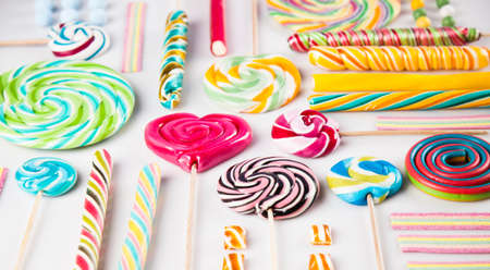 Colorful candies, lollypop on the colorful background, multicolored minimal style top view.