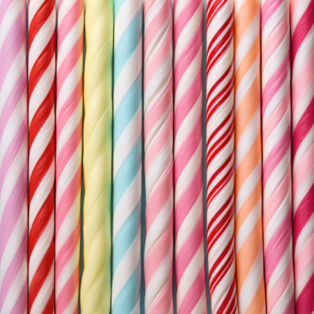A stunning arrangement of colorful twisted candy sticks on a pastel background. Perfect for conveying sweetness, fun, and joy in your designs.