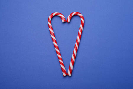 Heart shape made of sweet Christmas candy canes on blue background, top view