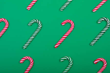 Composition of multiple green and red candy canes on green background. christmas, tradition and celebration concept.