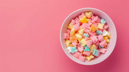 Top view of colorful candy pieces in a white bowl on a vibrant pink background. Bright and cheerful composition.