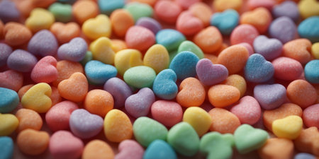 AI Generated. background of colorful pastel candies heart shape top view