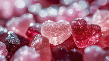 festive background with marmalade hearts, holiday and valentines day concept. Red heart shaped jelly candies